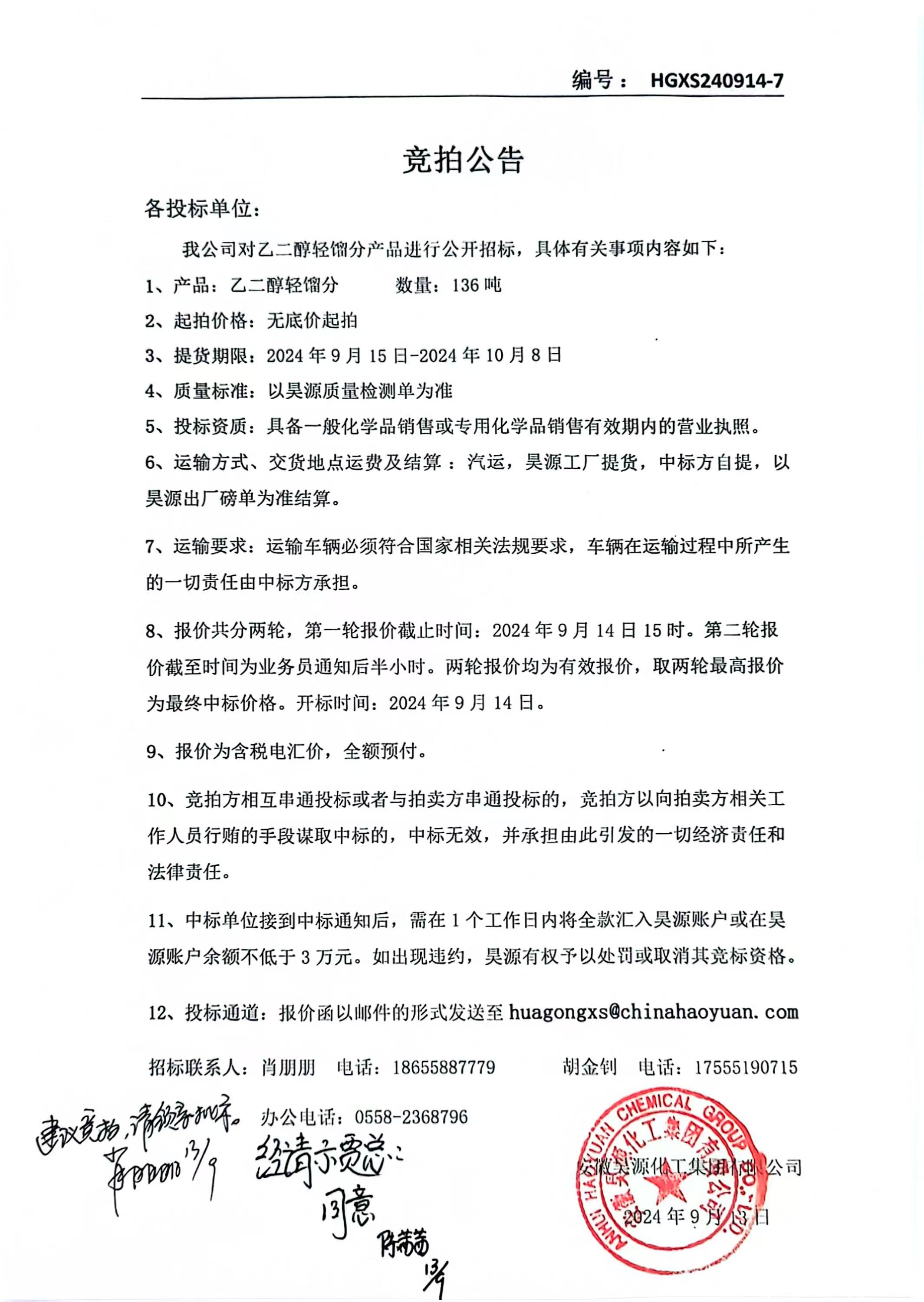 上一條:化工銷售乙二醇重餾分銷售招標公告下一條:化肥銷售工業(yè)鹽、無水硫酸鈉銷售招標公告