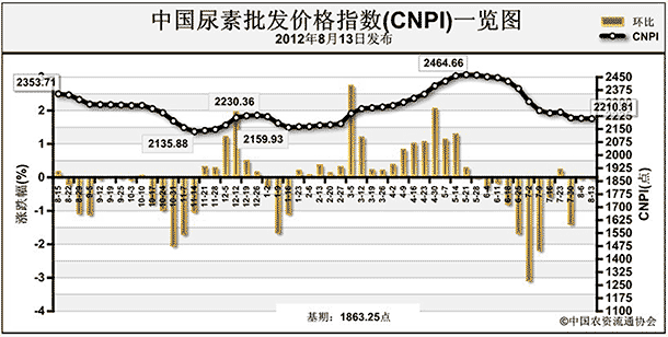 上周(8月6日-8月10日)國(guó)內(nèi)尿素市場(chǎng)需求疲軟,價(jià)格繼續(xù)下滑。8月13日CNPI為2210.81點(diǎn),環(huán)比下跌2.17點(diǎn),跌幅為0.10%;同比下跌142.90點(diǎn),跌幅為6.07%;;比基期上漲347.56點(diǎn),漲幅為18.65%。CNPI呈現(xiàn)疲軟震蕩態(tài)勢(shì)運(yùn)行。